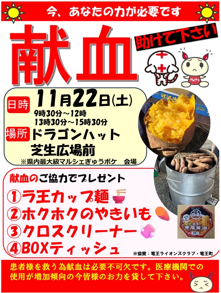 2025(令和7)年11月22日(土)10:00~ドラゴンハット前の広場にて献血例会を開催。
